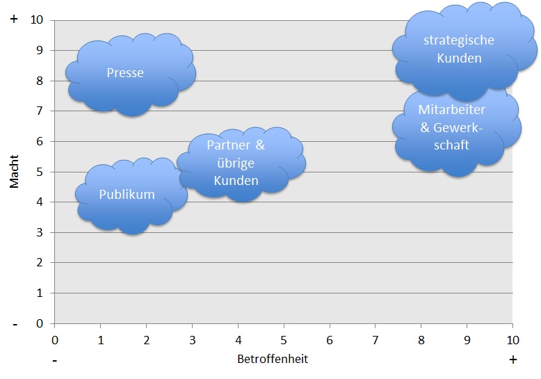 - sowohl Schlüsselkunden und Partner als auch die breite Öffentlichkeit hatten ein gesteigertes Interesse und verschiedene, teilweise starke Machtbefugnisse im Rahmen des Veränderungsprozesses.